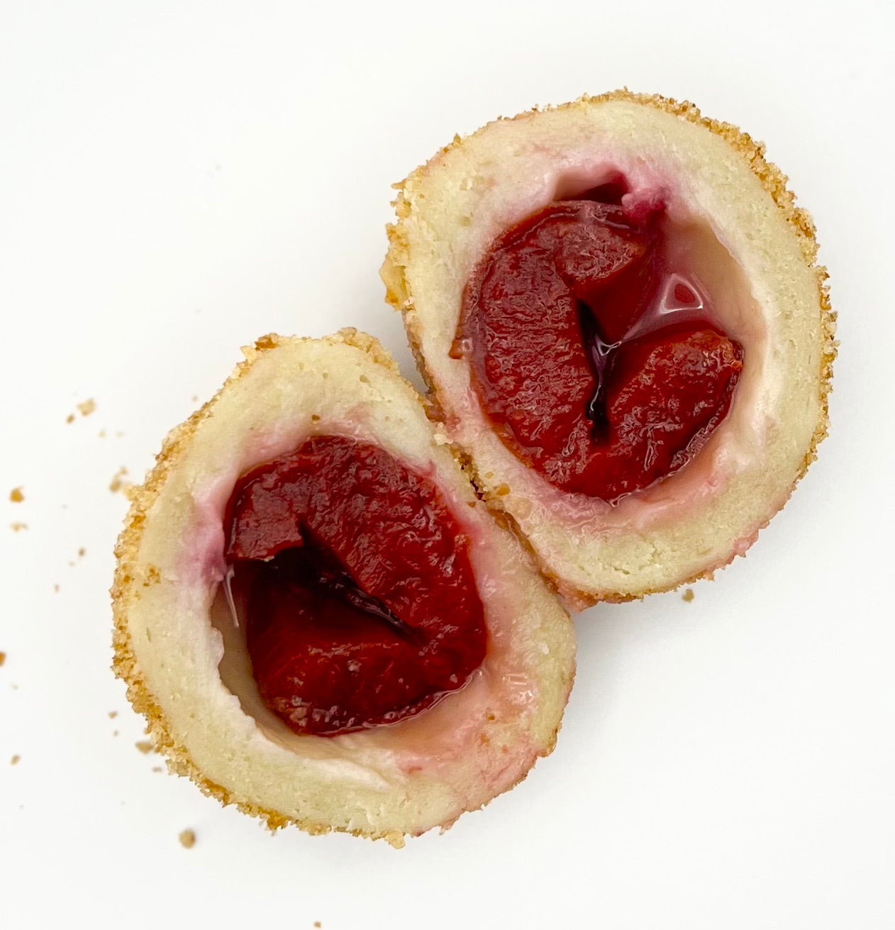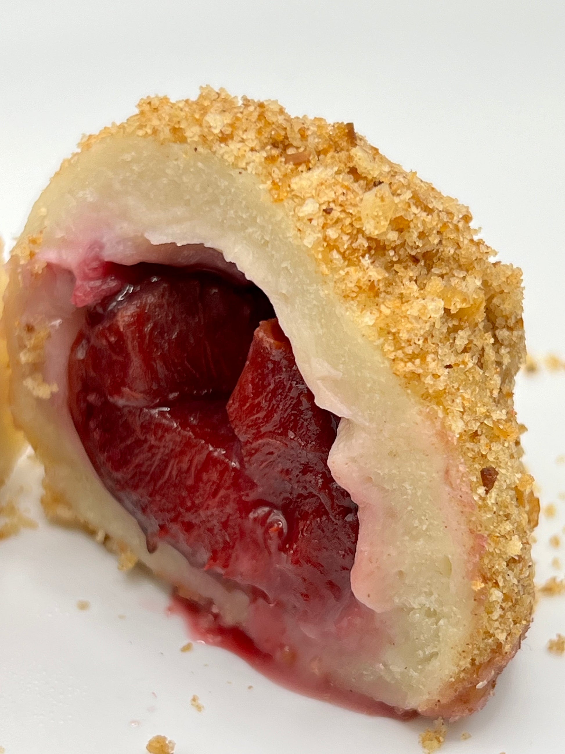 We start by filling our signature potato dough with locally sourced plums (pits removed). We then hand-make a knedla ball and coat it with our secret crumb coating. You can never go wrong with this choice! Yum!